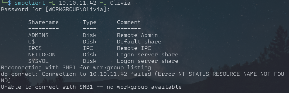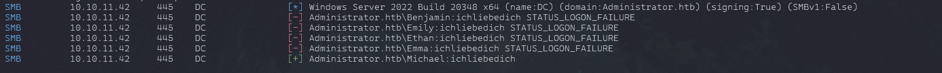 crackmapexec smb 10.10.11.42 -u FoundUsers.txt -p 'ichliebedich' -d Administrator.htbFound user michael has same password as Olivia