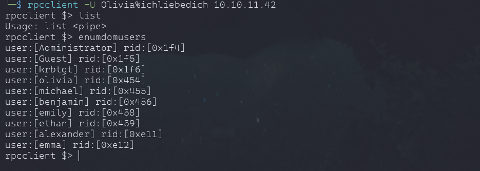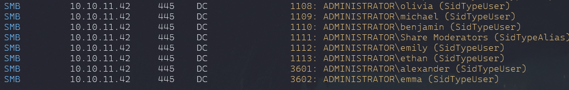crackmapexec smb 10.10.11.42 -u 'Olivia' -p 'ichliebedich' -d Administrator.htb --rid-brute