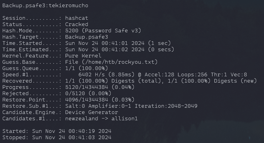 hashcat -m 5200 Backup.psafe3 /home/htb/rockyou.txt