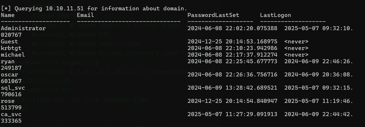 impacket-GetADUsers sequel.htb/rose:KxEPkKe6R8su -dc-ip 10.10.11.51 -all