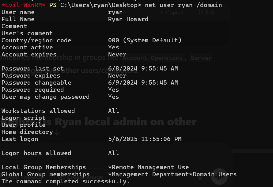 evil-winrm -u 'ryan' -p 'WqSZAF6CysDQbGb3' -i sequel.htb