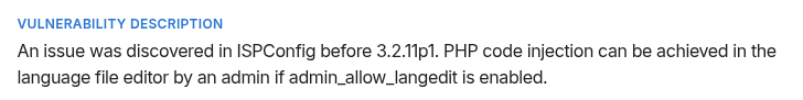 - An issue was discovered in ISPConfig before 3.2.11p1. PHP code injection can be achieved in the language file editor by an admin if admin_allow_langedit is enabled.
