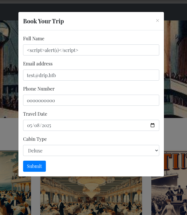 {"name": "Jack Dawson", "email": "jack.dawson@titanic.htb", "phone": "555-123-4567", "date": "2024-08-23", "cabin": "Standard"}