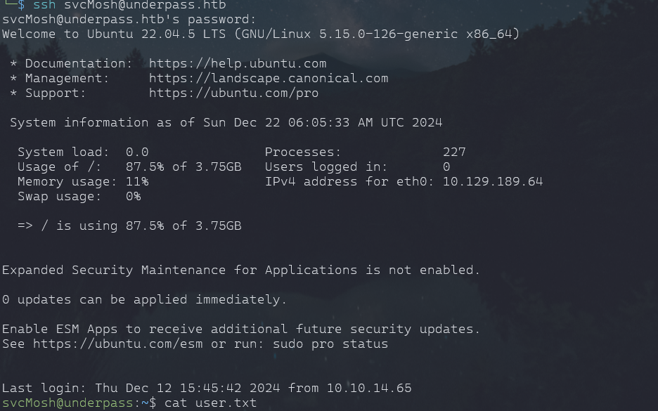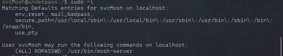 ssh svcMosh@underpass.htbPrivelege Escalation: