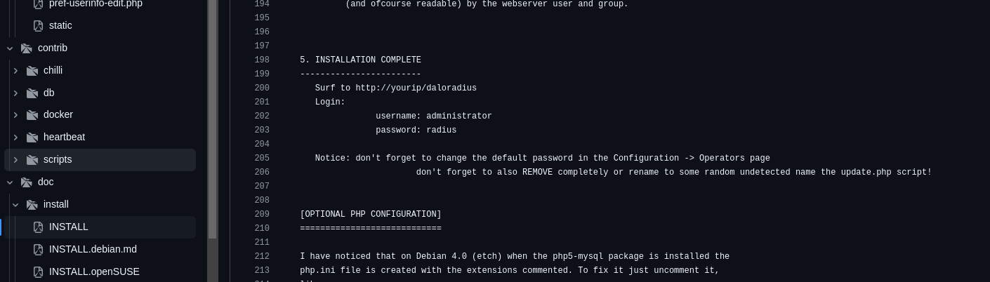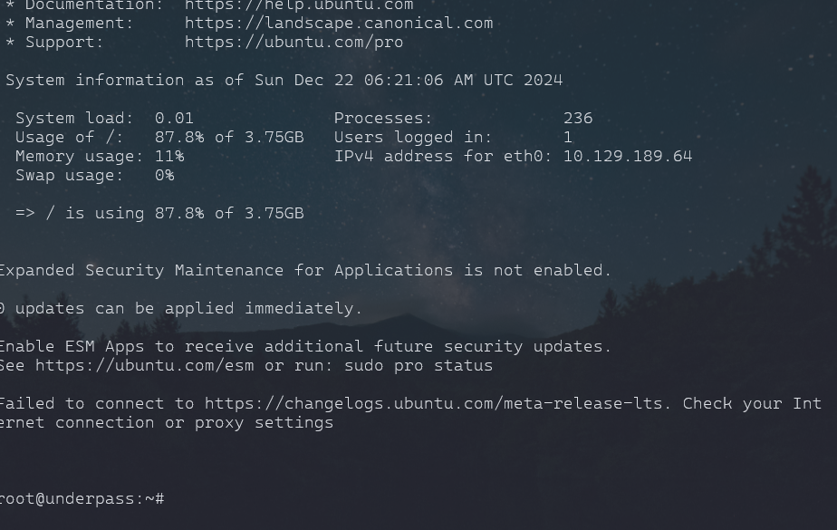Linux Underpass 5.15.0UnderPass.htb is only daloradius serverThe presence of a **daloRADIUS server** on **UnderPass.htb** could provide significant opportunities for enumeration and exploitation. **daloRADIUS** is a web-based front-end for managing FreeRADIUS, a RADIUS server implementation.- github